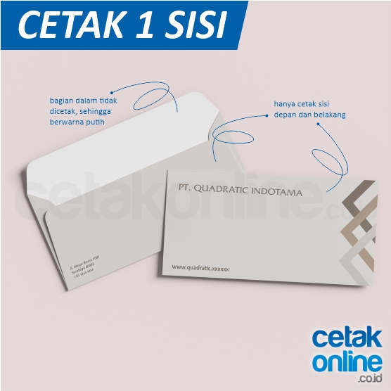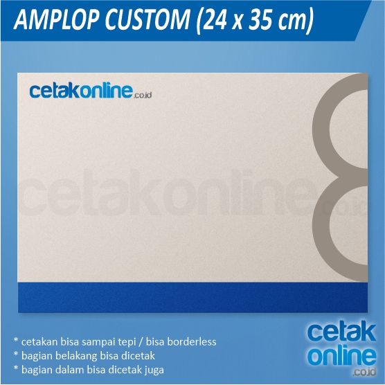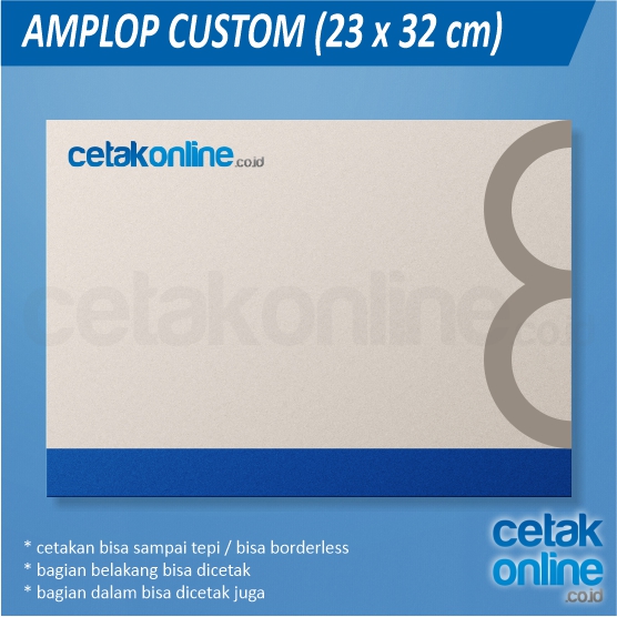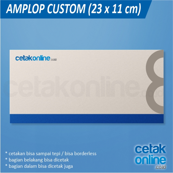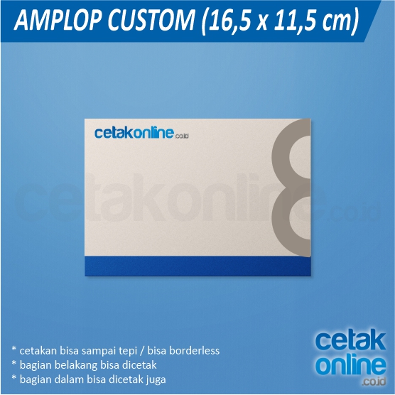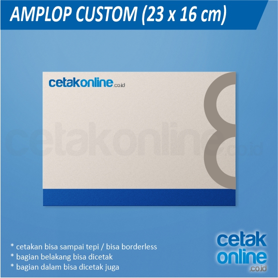 - amplop custom : dibuat sejak awal, bisa borderless, fullcolor, bisa menggunakan bermacam-macam kertas.