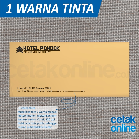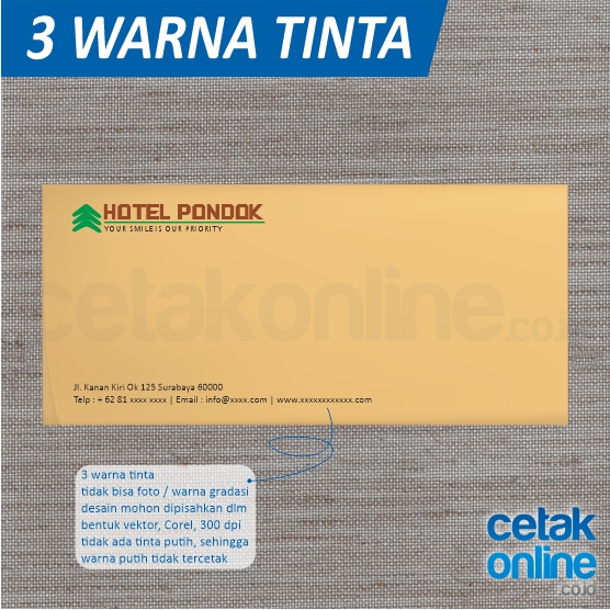 Untuk amplop sederhana 1warna, 2warna, 3 warna tinta : warna yang digunakan bukan warna gradasi, tidak bisa berupa foto yang terdiri dari beberapa warna. Warna tinta dihitung per warna yang digunakan.