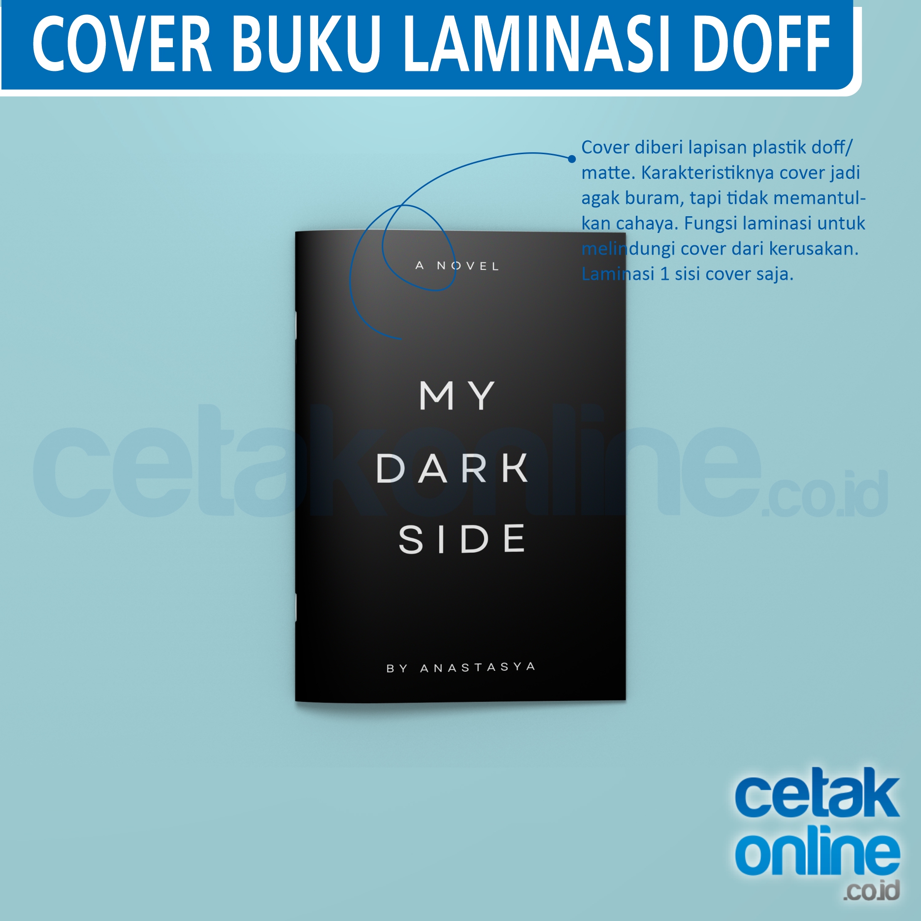Laminasi doff : permukaan kertas diberi lapisan plasti matte / doff, yang tidak memantulkan cahaya, gunanya sama untuk melindungi kertas dari kerusakan.