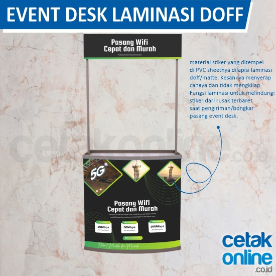 Yang pasti Anda bisa membuat desain Anda custom untuk ditampilkan di event desk. Buatnya hanya di cetakonline.co.id , Anda bisa pesan event desk dengan online.