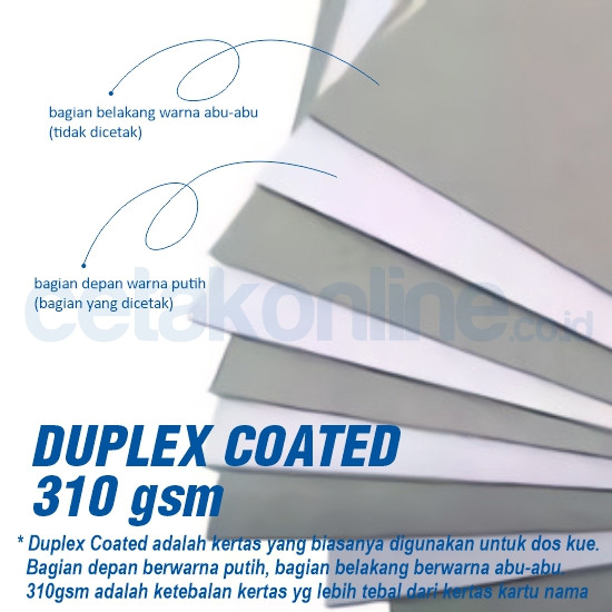 Duplex 250 - 310 gram : kertas duplex adalah kertas yang biasa digunakan untuk dos makanan. Bagian depan yang dicetak berwarna putih, bagian belakangnya yang tidak dicetak berwarna abu-abu.
