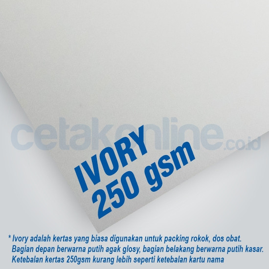 Ivory 250 - 300 gram : kertas ivory adalah kertas yang biasa digunakan untuk kemasan obat, kemasan rokok, dos makanan. Bagian depan yang dicetak berwarna putih agak glosy (tidak bisa ditulisi karena licin), bagian belakangnya yang tidak dicetak berwarna putih agak doff (bisa ditulisi). Sisi depan bersifat seperti artpaper (kertas untuk kartu nama), sisi belakang bersifat seperti matte paper.