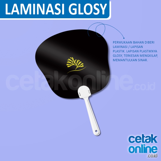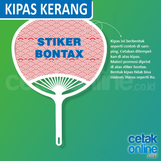 Untuk jenis kipas kerang, Anda tidak bisa mencustom bentuknya gagangnya, sudah harus sesuai dengan pola tersebut. Desain cetak kipas kerang bisa sesuai keinginan Anda. Untuk kipas kerang digunakan material cetaknya pada stiker bontax.