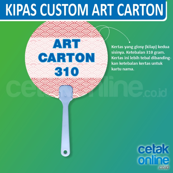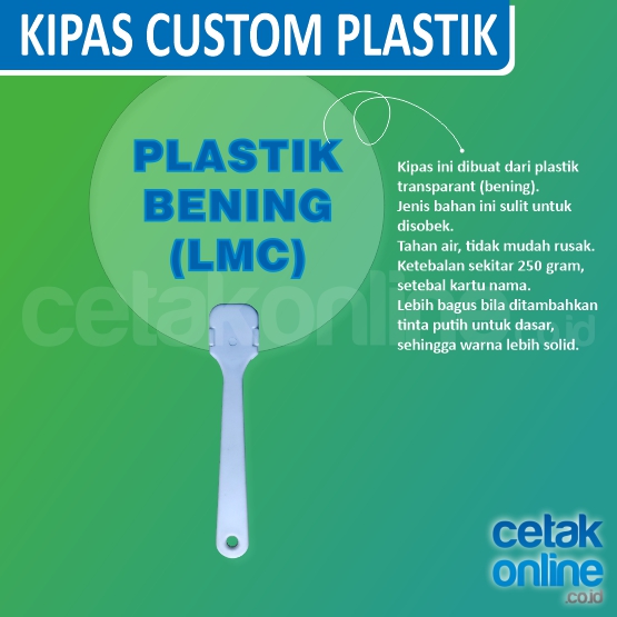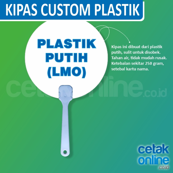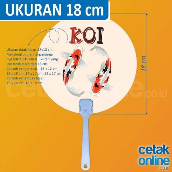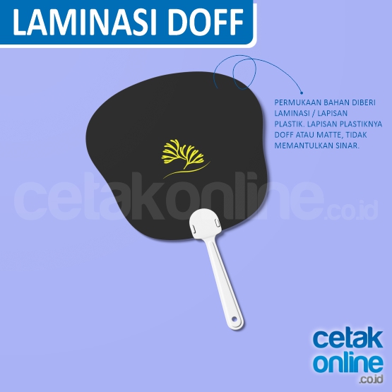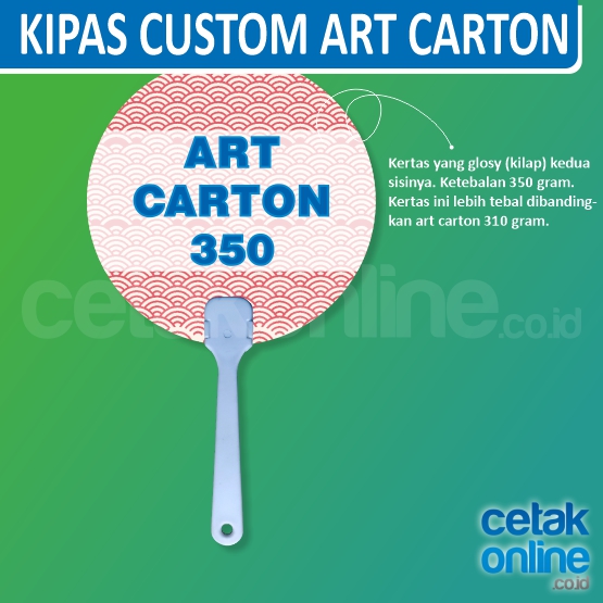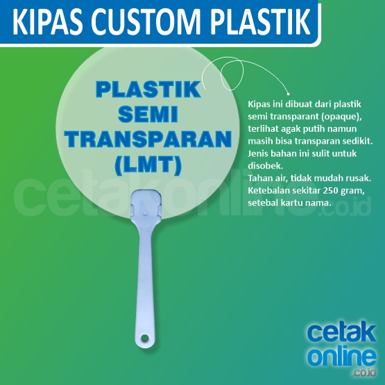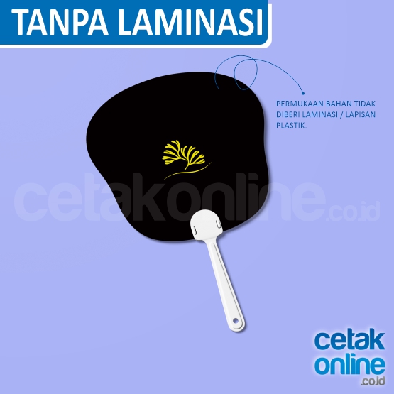 Harga sudah termasuk biaya cetak, gagang kipas, dan pemasangan kertas / plastik kaku pada gagang kipas.