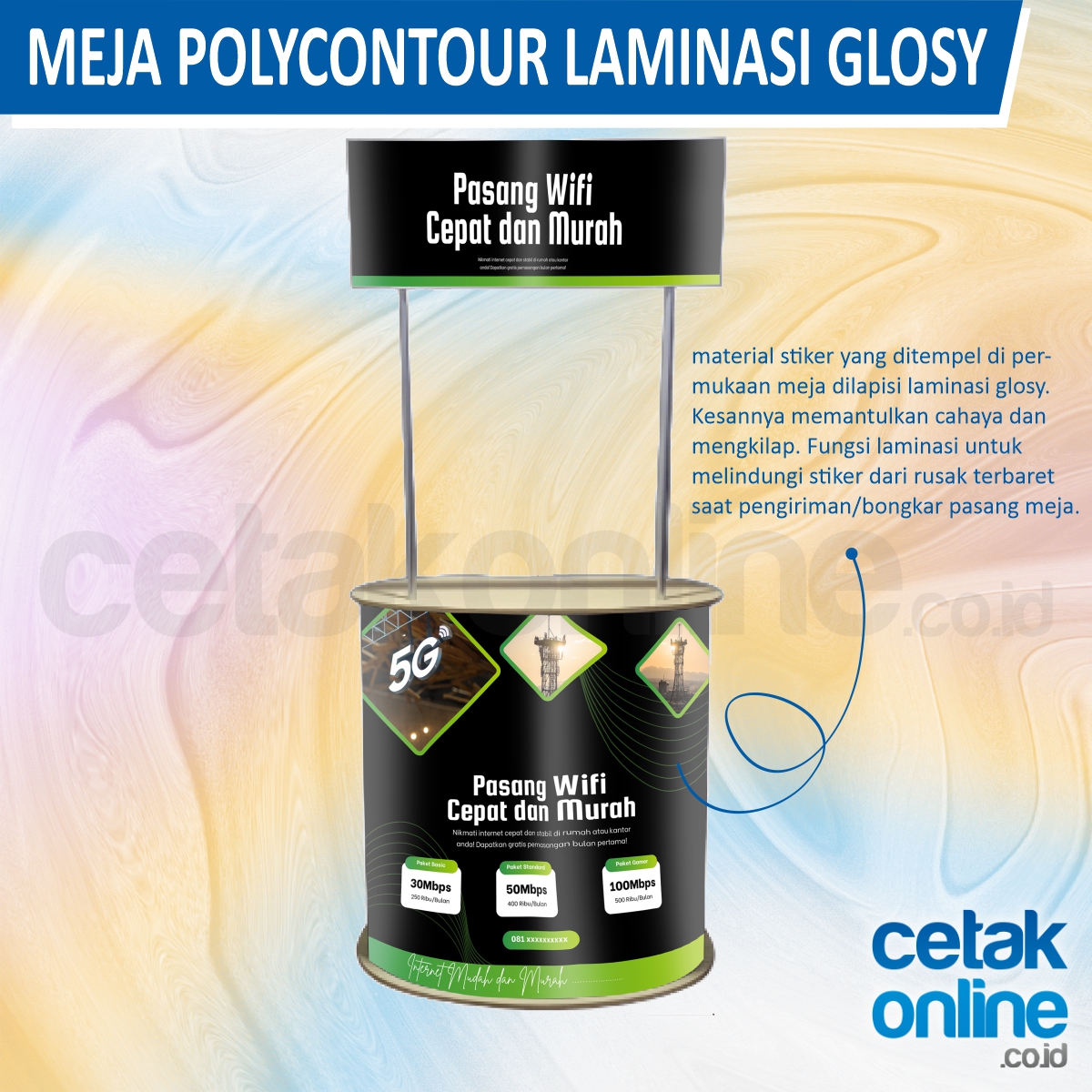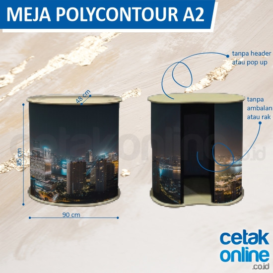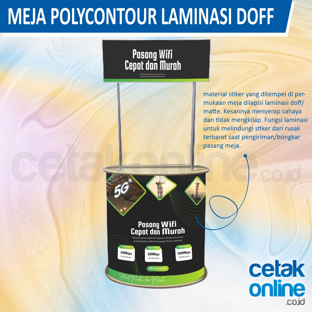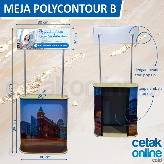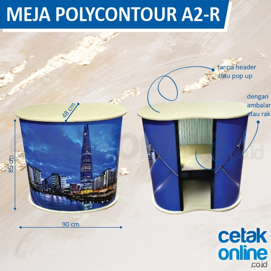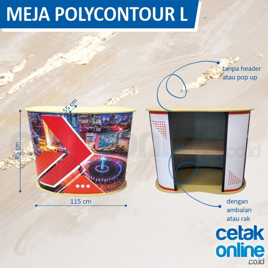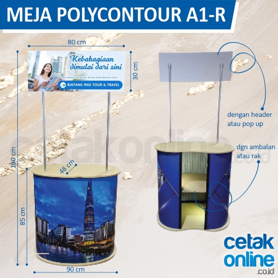 Meja polycontour adalah meja promosi yang bisa digunakan untuk pameran, expo, tenant di supermarket atau mall, di toko, bank, dll. Cocok untuk semua bidang usaha, mulai dari perbankkan, tour and travel, pendidikan, dll.