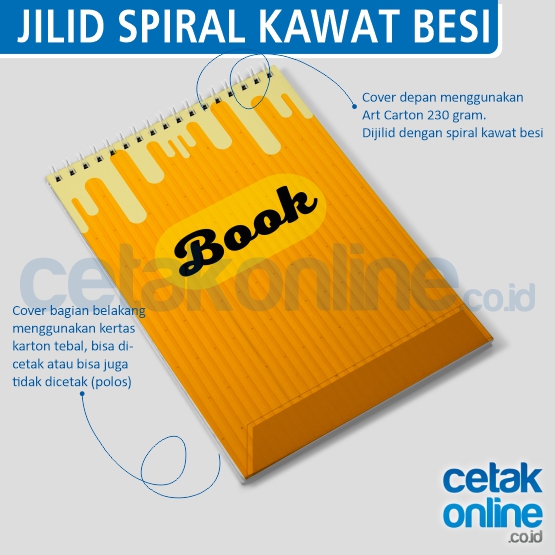 * Jilid spiral kawat besi (wire binding) bagian kiri. Cover jilid ini menggunakan kertas art carton 230 gram. Desain untuk cover ini jarak tulisan dan gambar