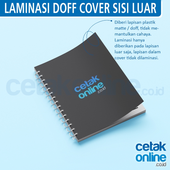Laminasi cover. Bisa tanpa laminasi, laminasi glosy (mengkilap), dan laminasi doff (matte)