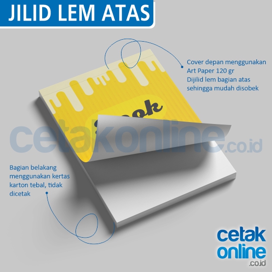 * Jilid lem atas. Cover nya dari kertas art paper 120 gram, bagian bawahnya adalah kertas karton. Untuk desain cover, tulisan dan gambar penting