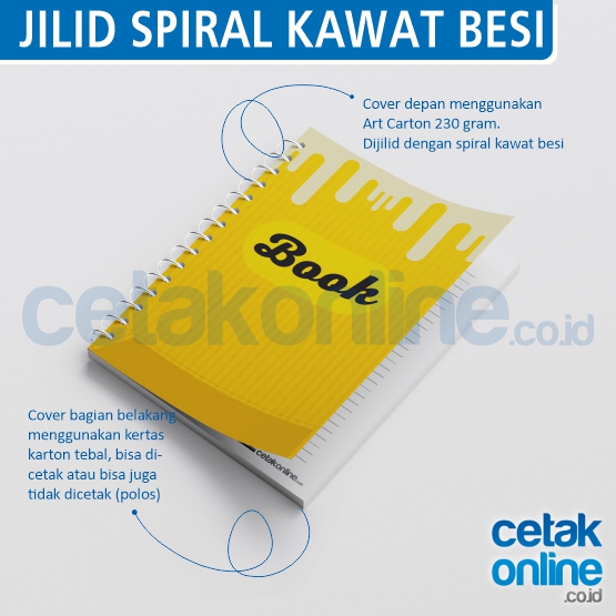 * Jilid spiral kawat besi (wire binding) bagian kiri. Cover jilid ini menggunakan kertas art carton 230 gram. Desain untuk cover ini jarak tulisan dan gambar