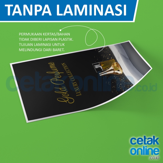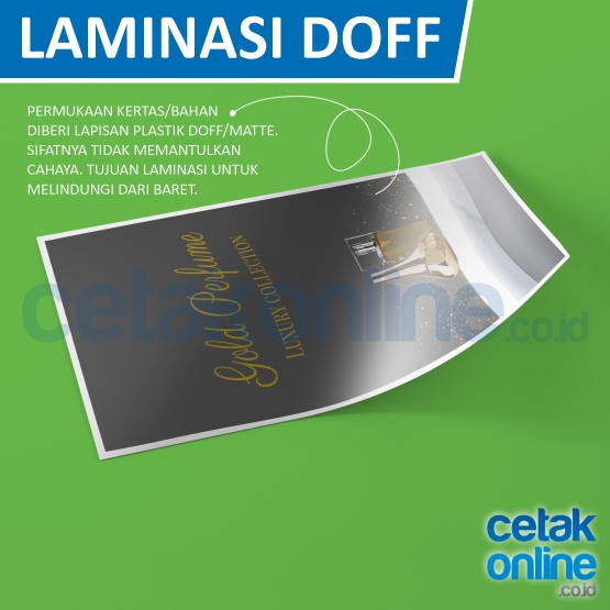 Laminasi doff : tampilan matte. Kesan yang timbul adalah mewah dan elegan.