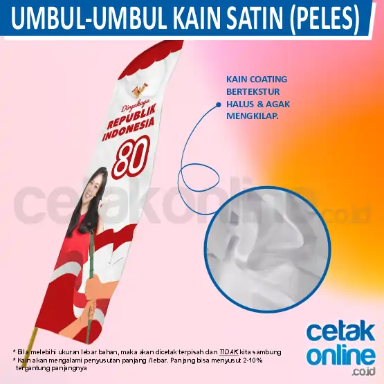 * Kain Satin (Peles) : kain ini agak mengkilap. Sudah dicoating agar bisa diprint. Kualitas kain bisa berbeda dari satu pemesanan ke pemesanan berikutnya.