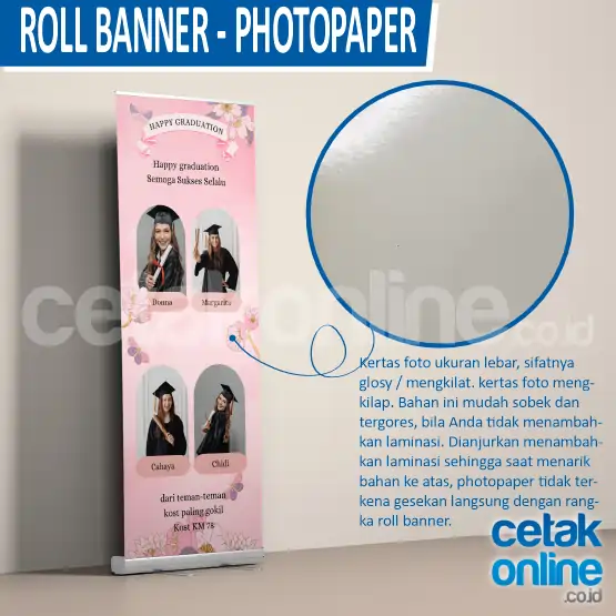 Photopaper : kertas foto ukuran lebar, sifatnya glosy / mengkilat. kertas foto mengkilap. Bahan ini mudah sobek dan tergores, bila Anda tidak menambahkan laminasi. Dianjurkan menambahkan laminasi sehingga saat menarik bahan ke atas, photopaper tidak terkena gesekan langsung dengan rangka roll banner.