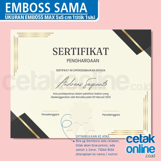 Emboss harus dilakukan di posisi yang sama dari setiap sertifikat dan piagam dan bentuk yang sama.
