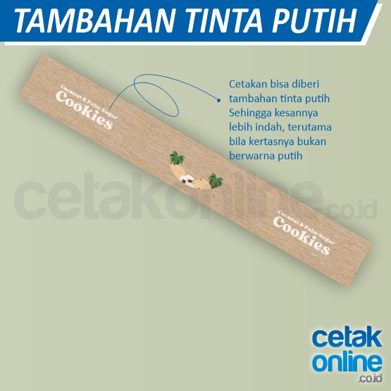 * Stiker kraft coklat adalah jenis stiker berwarna coklat bahan kertas. Kesan tradisional akan terasa jika menggunakan bahan ini. Kamu bisa menambahkan tinta putih di stiker jenis ini, sehingga sleeve atau paper belt kamu akan lebih mewah.