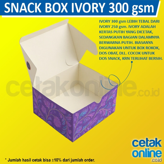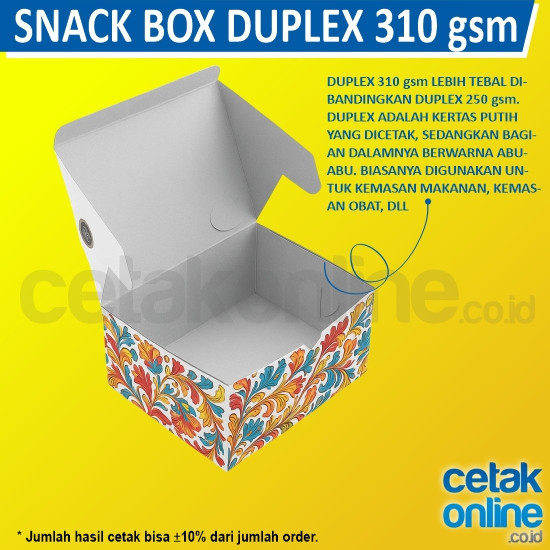 Buat sajianmu tampil lebih bagus dengan snack box ini. Terbuat dari bahan kertas premium, tersedia dalam beberapa macam jenis kertas. Custom nama toko / branding usaha Anda di sini.