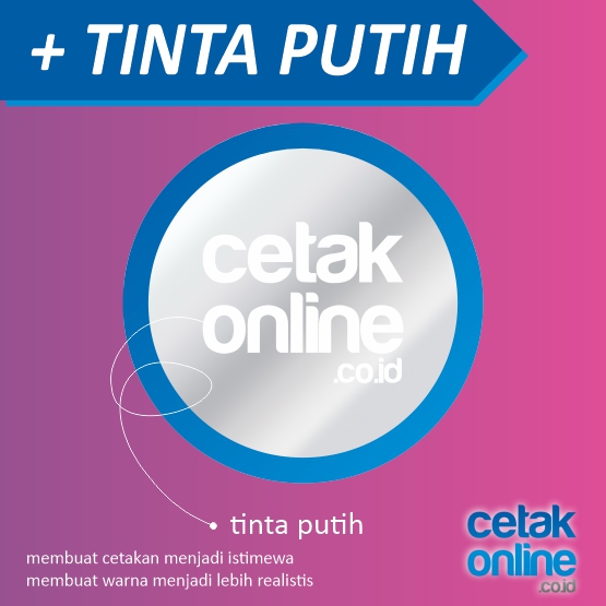 Kami tidak menggunakan tinta putih, sehingga desain yang ada warna putihnya tidak akan dicetak (artinya akan ikut warna dasar stikernya). Karena tidak menggunakan tinta putih, warna yang tampak di monitor akan mengalami penurunan kualitas warna / kesannya akan sedikit tercampur dengan warna dasar stiker.