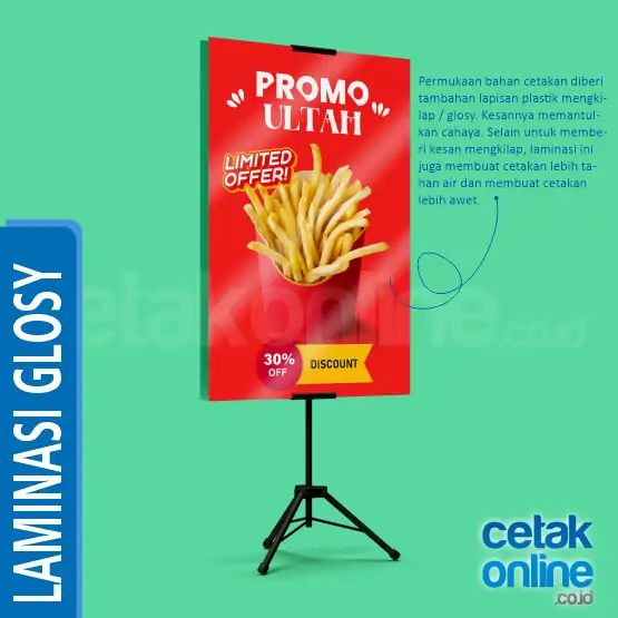 Laminasi glosy : tampilan tampak mengkilat karena diberi lapisan plastik mengkilat di atas permukaan bahan yang dicetak