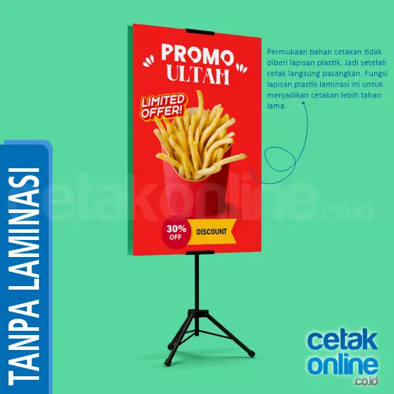 Materi promosi lapisannya digunakan foamboard, berbentuk seperti spon kaku dengan ketebalan 5mm. Dilapisi bagian depannya stiker yang dicetak dengan mesin ecosolvent.