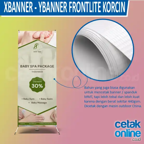 Flexi / Frontlite Korcin : bahan yang juga biasa digunakan untuk mencetak banner / spanduk MMT, tapi lebih tebal dan lebih kuat karena dengan berat sekitar 440gsm. Dicetak dengan mesin outdoor China.