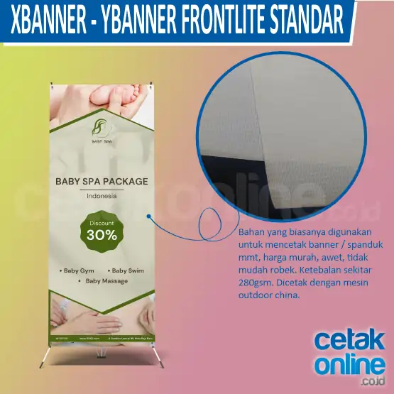Flexi / Frontlite Standart : bahan yang biasanya digunakan untuk mencetak banner / spanduk MMT, harga murah, awet, tidak mudah robek. Ketebalan sekitar 280gsm. Dicetak dengan mesin outdoor China.