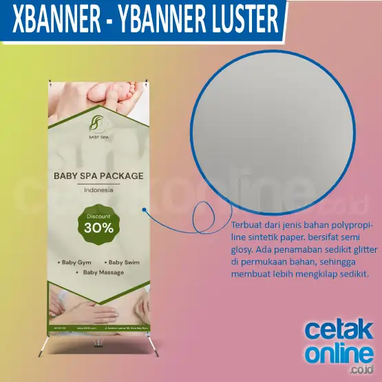 Luster : terbuat dari jenis bahan polypropiline sintetik paper. bersifat semi glosy. Ada penamaban sedikit glitter di permukaan bahan, sehingga membuat lebih mengkilap sedikit.